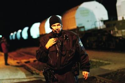 11月8日,在德國(guó)丹嫩貝格,一名防暴警察在運(yùn)載核廢料的列車(chē)旁工作。