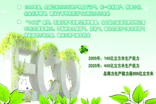 據(jù)悉,在進(jìn)入21世紀(jì)的10年間,我國政府對生物天然氣的投入高達(dá)240億元人民幣。2009年年底,全國已有3507萬農(nóng)戶用上了沼氣,在一些養(yǎng)殖戶、養(yǎng)殖小區(qū)、企業(yè)化養(yǎng)殖場,建設(shè)了各種類型沼氣工程達(dá)5.6萬多處,形成了每年140億立方米生產(chǎn)能力。中國已成為世界上沼氣發(fā)展速度最快、建設(shè)規(guī)模最大和涉及人群最多的國家。