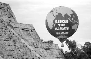 28日,在墨西哥坎昆的奇琴伊查瑪雅古城遺址旁,綠色和平組織升起一個(gè)巨大的熱氣球,呼吁人們保護(hù)環(huán)境 新華社圖