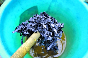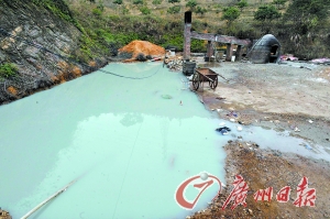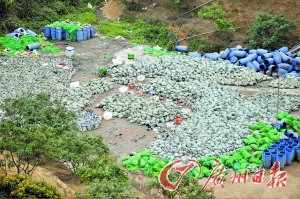在靠山腳下的一排爐子前面,一個年輕小伙正在焚燒用黑塑料袋裝著的東西。看到記者上前,一位操有粵西口音、年齡在40歲上下的老板模樣的人湊上前來!澳氵@是煉金嗎?”“不是煉金,搞點電鍍廠的廢水。”記者看到有一個盛有金黃色液體的玻璃器皿放在一個鐵盆上。在雨棚一側(cè),還堆有幾十個藍、黑色的塑料桶,桶口均用塑料袋堵住后,再用蓋子蓋上的。