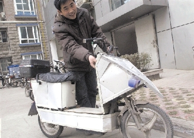2007年買的電動車沒跑多久,車身上就擦碰得不成樣子。看著車上磕磕碰碰留下的痕跡,小郭就利用自己做裝修的技術(shù),把平時生意上用剩下的邊角料按照車身的大小組裝了一個外殼,然后又用家裝廚衛(wèi)等使用的鋁扣板用鉚釘固定上去。此外,還加裝了照明燈和喇叭。電動車改裝四五個月來,每每走在街上,都引來眾人好奇的目光。