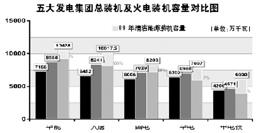 五家發(fā)電集團(tuán)的工作報告顯示,清潔能源發(fā)電比重自“十一五”以來得到了大幅增長。其中,中電投的清潔能源發(fā)電裝機容量占總裝機容量比重高達(dá)30%,拔得頭籌。根據(jù)2008年國家電監(jiān)會發(fā)布的《2007年電力企業(yè)節(jié)能減排情況通報》(以下簡稱《2007年通報》),中電投2007年裝機容量4300萬千瓦,其中火電裝機3327萬千瓦,占77.37%。根據(jù)2009年國家電監(jiān)會發(fā)布的《2008年電力企業(yè)節(jié)能減排情況通報》(以下簡稱《2008年通報》),這一比例并沒有發(fā)生太大變化。但2009年以來,中電投的清潔能源發(fā)電比重增加到了30%。拉西瓦水電站實現(xiàn)一年四投使中電投的水電裝機容量居五大發(fā)電集團(tuán)之首。預(yù)計隨著海陽核電、紅沿河核電和彭澤核電等項目的推進(jìn),這一比重還會大幅提升。
