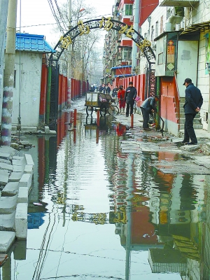 據(jù)居民介紹,西馬場(chǎng)北里只有這一條東西走向的胡同,居民出門、購(gòu)物都必須走這條路?涩F(xiàn)在路面每天汩汩往外冒臭水,人們只好用方磚沿著胡同北面鋪了一條窄路勉強(qiáng)通行,而現(xiàn)在那些方磚也被臭水淹沒(méi)了,居民通行更加困難。