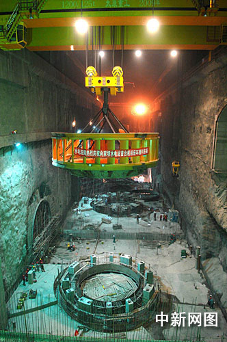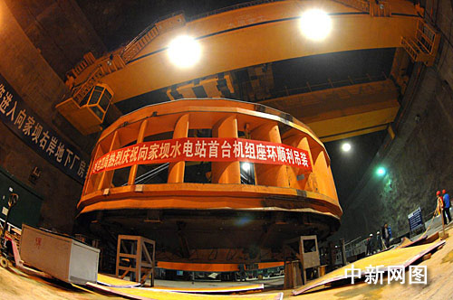 3月23日上午10點40分,在向家壩水電站右岸的地下隧道內(nèi),施工人員用8組鋼纜將重量達(dá)362噸、直徑達(dá)14.38米的座環(huán)固定在1200噸的橋機(jī)上。橋機(jī)緩緩將座環(huán)提升到距離地面2米的高度,慢慢平移近100米,到地下廠房基坑1號機(jī)組基座上方。座環(huán)平穩(wěn)地放在了1號機(jī)組基座上,吊裝完成。