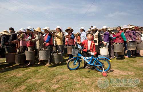 在云南楚雄州子午鎮(zhèn)法邑村3月13號打出的新井前,幾個村民陸續(xù)挑著空桶前來挑水,十幾個水桶依次并成兩排,不到10分鐘就全都裝滿了。