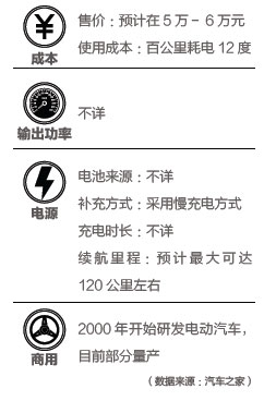 4月初,奇瑞汽車在其總部安徽蕪湖舉行了QQ3純電動汽車用戶交車儀式。奇瑞汽車總經(jīng)理助理金弋波告訴《中國經(jīng)濟(jì) 周刊》:“QQ3純電動轎車采用純電驅(qū)動,百公里耗電僅12度左右。目前該車已經(jīng)順利通過國家安全碰撞測試,并已上榜工信部《節(jié)能與新能源汽車示范推廣工程推薦車型目錄》!