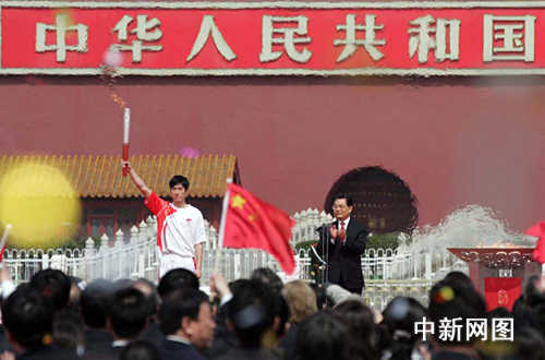 3月31日,北京奧運會圣火歡迎儀式暨傳遞啟動儀式在北京天安門廣場啟動。圖為著名運動員、火炬手代表劉翔從胡錦濤主席手中接過火炬。中新社發(fā) 張宇 攝