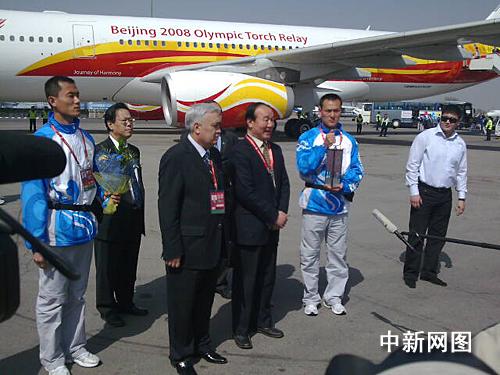 “和諧之旅”的首站之行非常順利,奧運(yùn)包機(jī)比原定時(shí)間早一些到達(dá)阿拉木圖的機(jī)場(chǎng)。當(dāng)?shù)販囟?6°C,天氣特別晴好。北京奧組委執(zhí)行副主席蔣效愚提著圣火燈走下舷梯,受到了前來(lái)迎接的阿拉木圖市和哈薩克斯坦奧委會(huì)代表,以及該市市民的熱烈歡迎。在展示圣火燈后,蔣效愚將其交給隨行的兩位圣火護(hù)衛(wèi)隊(duì)員。隨后,蔣效愚接受了當(dāng)?shù)孛襟w采訪,表示很高興圣火來(lái)到阿拉木圖,希望能夠促進(jìn)兩國(guó)的友好關(guān)系。攝影/記者 沈晨