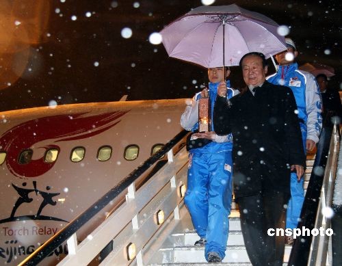 巴黎時(shí)間六日晚十一時(shí)四十五分(北京時(shí)間七日凌晨五時(shí)四十五分),北京奧運(yùn)圣火傳遞“和諧之旅”抵達(dá)第五站“浪漫之都”法國(guó)巴黎,中國(guó)駐法大使孔泉和法國(guó)體育官員到瑞雪紛飛的機(jī)場(chǎng)迎接。圖為北京奧組委副主席蔣效愚等護(hù)送北京奧運(yùn)圣火走下專機(jī)。