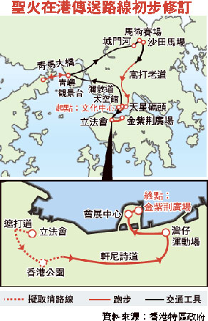 周一凌晨警方的火炬跑路線測試后,發(fā)現(xiàn)有“超時(shí)”情況,加上為減低火炬被搶或弄熄的風(fēng)險(xiǎn),有關(guān)單位計(jì)劃縮短某些不必要的行程,例如原定在港島的傳遞路線,是由立法會開始,然后經(jīng)遮打道、香港公園、軒尼詩道再去灣仔,但有關(guān)單位有意刪減兜入香港公園的地段。消息指出,香港火炬手仍會維持120人,但各人運(yùn)送路程可能略作調(diào)整。