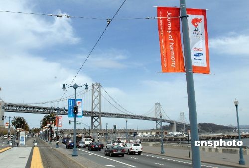 當(dāng)?shù)貢r間四月八日,舊金山海灣大橋附近的濱海大道,“二00八北京奧運火炬接力”旗幟高掛。北京奧運圣火當(dāng)天凌晨抵達舊金山,九日將進行六英里長的火炬接力,屆時將有成千上萬的華人華僑前往現(xiàn)場迎接。