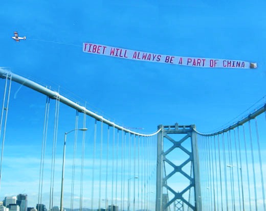 華人華僑還為這次傳遞活動(dòng)租用了兩架直升飛機(jī),盤旋在沿途的上空。一架飛機(jī)上用英文拉出橫幅,“TIBET WILL AIWAYS BE A PART OF CHINA(西藏永遠(yuǎn)是中國(guó)的一部分)”,另外一個(gè)橫幅是:“GO BEIJING CHINA!GO OLYMPICS!(歡迎到北京看奧運(yùn)會(huì))”。
