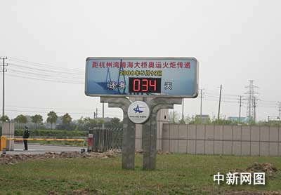 杭州灣跨海大橋做好奧運火炬?zhèn)鬟f最后準(zhǔn)備,據(jù)寧波市相關(guān)人士介紹說,在大橋?qū)幉ǘ蔚幕鹁媸謱⒚咳伺?00米。