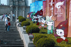 為迎接5月3日北京奧運圣火于澳門傳遞,現(xiàn)在澳門部分街道如地標(biāo)大三巴牌坊等名勝掛上火炬?zhèn)鬟f的宣傳裝飾,為迎接即將來臨的火炬作好準(zhǔn)備。