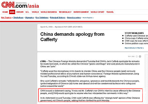 在CNN網(wǎng)站首頁中部的“Popular News”欄目中,刊登了《China demands apology from Cafferty(中國要求卡弗蒂道歉)》一文。文章前三段陳述了中國外交部對卡弗蒂言論的指責(zé)及要求卡弗蒂道歉的情況,在第四段中這樣說:CNN發(fā)表了一份聲明稱:“不論是卡弗蒂先生本人,還是CNN,都無意冒犯中國民眾;在這里,我們愿向受到此言論影響的人們道歉!