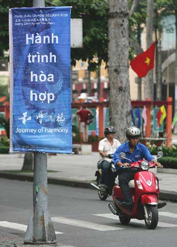 盡管北京奧運(yùn)圣火還未抵達(dá),但胡志明市為了迎接圣火的到來做好了各種準(zhǔn)備。在胡志明市街頭,處處可見懸掛著宣傳北京奧運(yùn)圣火傳遞活動的彩旗。