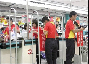 昨天上午9點(diǎn)半左右,在白石橋方圓店,家樂福店員們穿著紅黃兩色的新裝,胸前印著國旗,有的帽子上印著“beijing2008”字樣,有的印著五環(huán)和中國印等標(biāo)識(shí)。記者隨后又來到家樂福中關(guān)村店和國展店,兩店的員工也大多身著新裝頭戴新帽。國展店一位女店員說,4月26日,店里給員工發(fā)了新的員工裝,據(jù)說成本是帽子80元、上裝近200元。