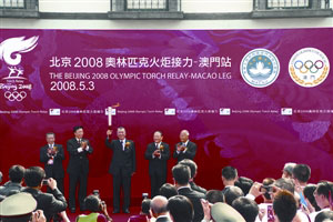北京奧運火炬接力第21站——澳門站的起步儀式,3日下午3時半在漁人碼頭勵駿廣場舉行,由行政長官何厚鏵,中聯(lián)辦主任白志健,國際奧委會主席羅格的代表、國際奧委會委員、中國奧委會名譽主席何振梁,北京奧組委執(zhí)行副主席楊樹安,中國澳門奧委會主席藍鏵纓主禮,并為澳門站120位火炬手打氣。