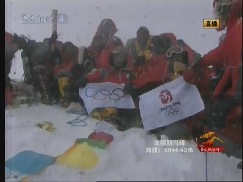 北京奧運圣火成功今天上午9時許登上珠峰,登山隊員們在峰頂進行了火炬接力,圖為接力活動結(jié)束后,隊員們在世界之巔展示熊熊燃燒的祥云火炬以及中國國旗、奧運五環(huán)旗和北京奧運會會徽旗。圖為電視截圖。