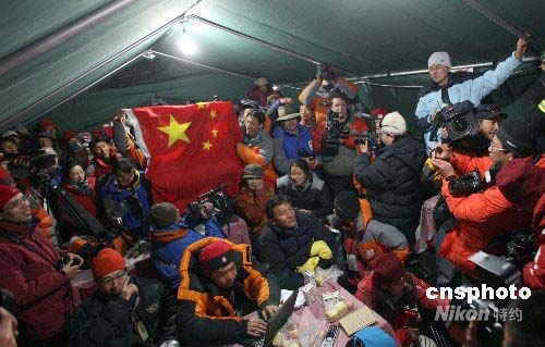 5月8日,中外媒體以及工作人員在珠峰大本營新聞中心內(nèi)歡慶北京奧運圣火成功登頂珠峰。中新社發(fā) 盛佳鵬 攝