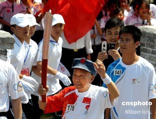 5月14日,95歲高齡的劉家奇老人在中華蘇維埃共和國(guó)中央政府舊址的“紅井”傳遞奧運(yùn)圣火。 中新社發(fā) 廖攀 攝