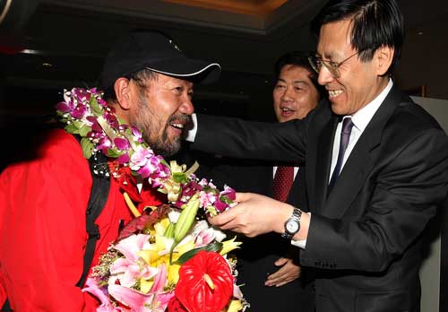中新網(wǎng)5月15日電 據(jù)第29屆北京奧運官網(wǎng)消息,北京時間今天凌晨4點,奧運火炬珠峰傳遞中國登山隊部分隊員及工作人員乘機抵達北京。國家體育總局局長、北京奧組委執(zhí)行主席劉鵬,北京奧組委執(zhí)行副主席蔣效愚等領導,國家體育總局、北京奧組委相關部門負責人,以及登山隊員家屬、同學等到首都國際機場迎接。