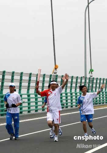 5月22日,奧運(yùn)火炬?zhèn)鬟f寧波站最后一棒火炬手嚴(yán)宏軍,高舉火炬跑過(guò)杭州灣跨海大橋。這是全世界跨度最長(zhǎng)的跨海大橋,嚴(yán)宏軍是這座大橋的建設(shè)者之一。 中新社發(fā) 周兆軍 攝