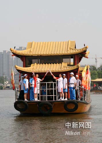 5月22日,奧運(yùn)圣火來(lái)到浙江嘉興。圖為奧運(yùn)圣火在南湖水上傳遞。