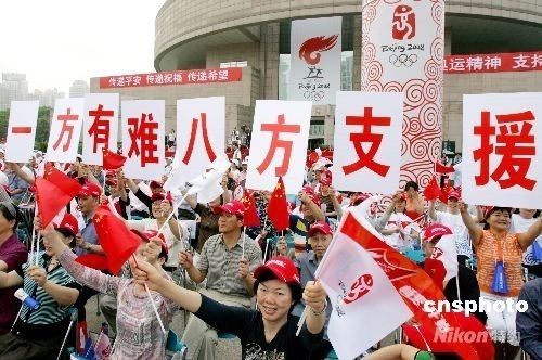 5月23日,北京奧運圣火在上海開始傳遞。上海市民在喜迎奧運圣火的同時,更心系著四川地震災(zāi)區(qū)人民,在火炬?zhèn)鬟f沿途高舉“一方有難,八方支援”、“團結(jié)一致,眾志成城”等橫幅,表達和四川地震災(zāi)區(qū)民眾共度難關(guān)的決心。 中新社發(fā) 湯彥俊 攝