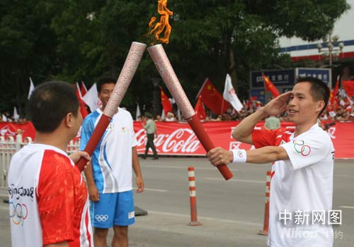 9時36分,黃勝新接力點燃手中的火炬時,又莊嚴(yán)的行了一個軍禮,激動之情溢于言表!暗诙䝼軍禮我是向火炬敬的!”黃勝新說, “盡管祖國經(jīng)歷了汶川大地震,但是看到奧運的圣火在自己的面前順利的傳遞,就相信祖國一定能戰(zhàn)勝震災(zāi),更相信祖國有決心、也更有信心把奧運會辦好,為祖國加油,為奧運增彩!