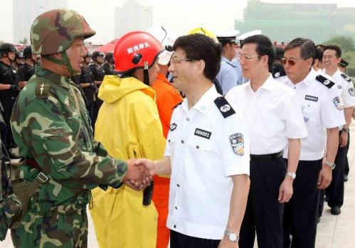 中新網(wǎng)6月25日電 據(jù)中國公安部網(wǎng)站消息,國家反恐怖教學(xué)性演習(xí)暨天津“濱海六號”演習(xí)6月24日起在天津舉行。中共中央政治局委員、天津市委書記張高麗,國務(wù)委員、公安部黨委書記、部長孟建柱觀看了 “處置化學(xué)恐怖襲擊事件”的演習(xí)并實地檢查了奧運場館的安全保衛(wèi)工作。