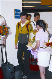 圖:隊(duì)長(zhǎng)馮坤接受歡迎花束。(圖片來(lái)源:澳門日?qǐng)?bào))