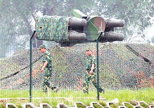 兩名中國士兵在“鳥巢”附近的防空導(dǎo)彈系統(tǒng)前巡