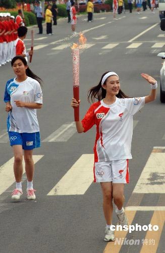 7月10日,奧運火炬在內蒙古赤峰進行傳遞,漂亮的女大學生張萌作為赤峰火炬手傳遞奧運火炬。中新社發(fā) 廖攀 攝