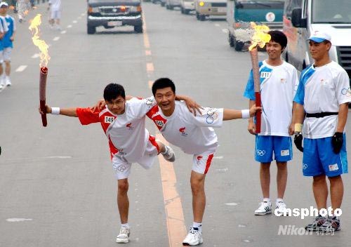 7月15日,奧運火炬開始在吉林松原傳遞,火炬手徐建、成聰在傳遞中擺出飛翔造型。中新社發(fā) 廖攀 攝