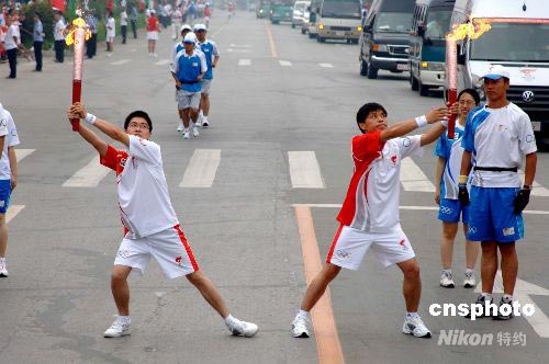 7月15日,奧運(yùn)火炬在吉林松原傳遞;鹁媸智f(wàn)日(右)、張世民以?xún)?yōu)美姿態(tài)交接火炬。中新社發(fā) 廖攀 攝