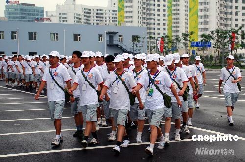 7月15日早上,駐京海軍某部300名官兵身著統(tǒng)一服裝到鳥巢參加奧運(yùn)開幕式彩排。據(jù)了解,北京奧組委采取嚴(yán)格的保密措施防止開幕式節(jié)目內(nèi)容泄露,為此“鳥巢”外圍戒備森嚴(yán),共有三層隔離護(hù)欄,由公安、武警把守。“鳥巢”上空的制高點(diǎn)也被全面封鎖,防止高空偷拍。 中新社發(fā) 楊慧峰 攝