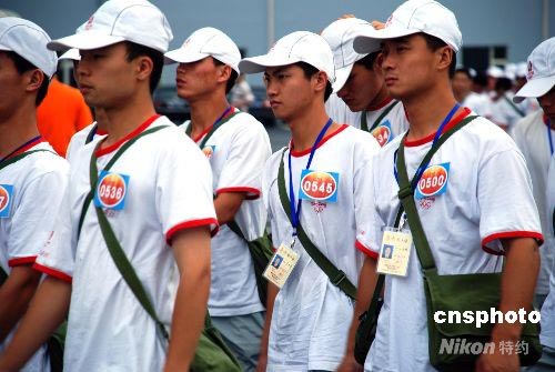 7月15日早上,駐京海軍某部300名官兵身著統(tǒng)一服裝到鳥巢參加奧運開幕式彩排。 中新社發(fā) 楊慧峰 攝