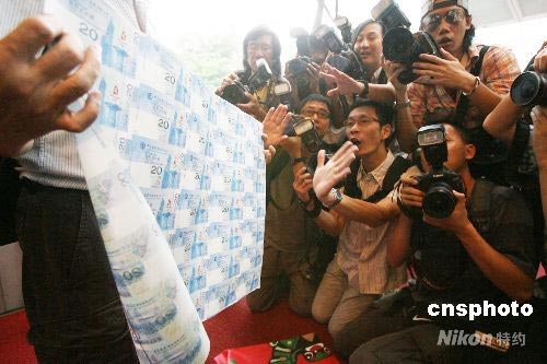 七月十六日,奧運紀念鈔票在香港火爆開售,眾多市民通宵在中銀香港總行外輪候。圖為買到紀念鈔的市民向媒體展示。 中新社發(fā) 武仲林 攝