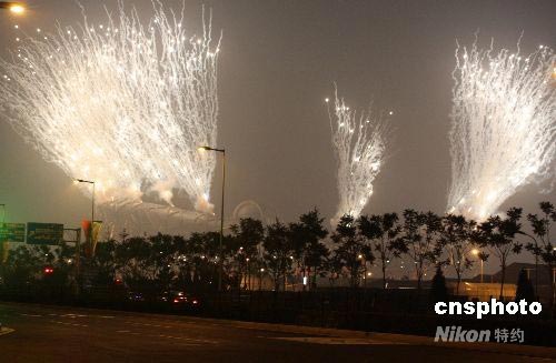 7月16日晚,北京奧運(yùn)會(huì)開幕式彩排首次燃放禮花,鳥巢上空絢爛多彩。中新社發(fā) 吳芒子 攝