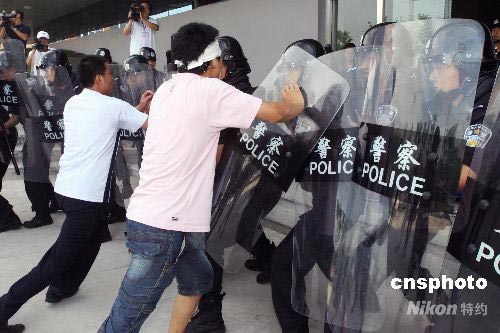 奧運(yùn)村法庭舉行奧運(yùn)安保演練。發(fā)生“突發(fā)事件”時(shí),法警使用盾牌將鬧事“當(dāng)事人”與遭到圍攻的法官分隔開。中新社發(fā) 劉新 攝