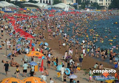 青島第一海水浴場游泳的游人爆滿。經(jīng)過一個多月的全力奮戰(zhàn),困擾2008北京奧運(yùn)會帆船賽舉辦地青島的近海滸苔已得到了有效的清除和遏制,奧帆賽訓(xùn)練比賽場地和海水浴場又恢復(fù)了往日的熱鬧景象。中新社發(fā) 曲連遵 攝