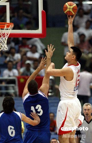 備戰(zhàn)北京奧運(yùn)會(huì)的中國男籃,7月17日晚在杭州舉行的2008斯坦科維奇洲際杯籃球賽的首場比賽中以96比72戰(zhàn)勝幾乎全部為年輕選手組成的塞爾維亞隊(duì)。中國隊(duì)的“擎天柱”姚明受重傷143天后首次登場,砍下11分。中新社發(fā) 任晨鳴 攝