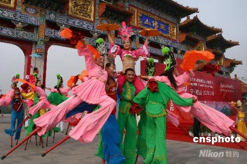 7月18日,北京奧運(yùn)火炬在遼寧鞍山傳遞,當(dāng)?shù)氐母哕E秧歌隊(duì)亮出絕活,激情迎接奧運(yùn)火炬。 中新社發(fā) 周兆軍 攝