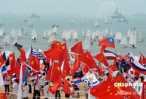 奧運火炬在山東青島傳遞,在傳遞終點青島第一海水浴場,青島青年在帆船密布的海邊揮舞旗幟為北京奧運加油。中新社發(fā) 廖攀 攝