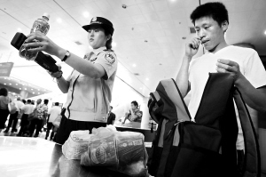 昨天10時許,記者先來到北京西站進站口,比以往更加嚴格的是,這里除了對每件行李進行機檢外,民警還輔助用手持液體查危儀對行李中的液體進行檢查,現(xiàn)場鐵警告訴記者:“如果發(fā)現(xiàn)行李中攜帶了液體,我們將會要求旅客將液體拿出,并用儀器進一步檢測液體安全!甭每褪掷锬弥钠垦b水,開蓋的則要求當場喝一口,沒有開蓋的則也要過液體安檢儀。