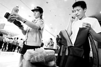 昨天10時(shí)許,記者先來(lái)到北京西站進(jìn)站口,比以往更加嚴(yán)格的是,這里除了對(duì)每件行李進(jìn)行機(jī)檢外,民警還輔助用手持液體查危儀對(duì)行李中的液體進(jìn)行檢查,現(xiàn)場(chǎng)鐵警告訴記者:“如果發(fā)現(xiàn)行李中攜帶了液體,我們將會(huì)要求旅客將液體拿出,并用儀器進(jìn)一步檢測(cè)液體安全!甭每褪掷锬弥钠垦b水,開(kāi)蓋的則要求當(dāng)場(chǎng)喝一口,沒(méi)有開(kāi)蓋的則也要過(guò)液體安檢儀。