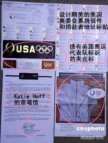 7月22日,記者收到的一封募捐信說:你只需捐20美元,就可以獲得一件如圖所示的繡著美國奧運代表隊標記的運動夾克。更重要的是,這意味著你支持了美國奧運代表隊前往北京參賽的路費。信中還附有美國游泳女一號種子選手霍芙的親筆募捐信。圖為來自美國奧委會的募捐信件內(nèi)容。 中新社發(fā) 邱江波 攝