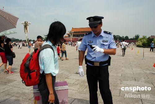 近日,奧運(yùn)臨近,天安門廣場(chǎng)民警對(duì)游客攜帶物品檢查越來(lái)越嚴(yán)格。圖為巡邏的民警正在盤查游客包裹,以保障奧運(yùn)會(huì)順利進(jìn)行。中新社發(fā) 張雙雙 攝