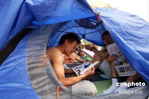 7月24日下午,北京的大學(xué)生搭著帳篷冒酷暑等待購買最后一批奧運門票。奧運第四階段門票銷售即將于25日正式開始,24日一大早就有大批民眾前往等候買票。中新社發(fā) 王東明 攝